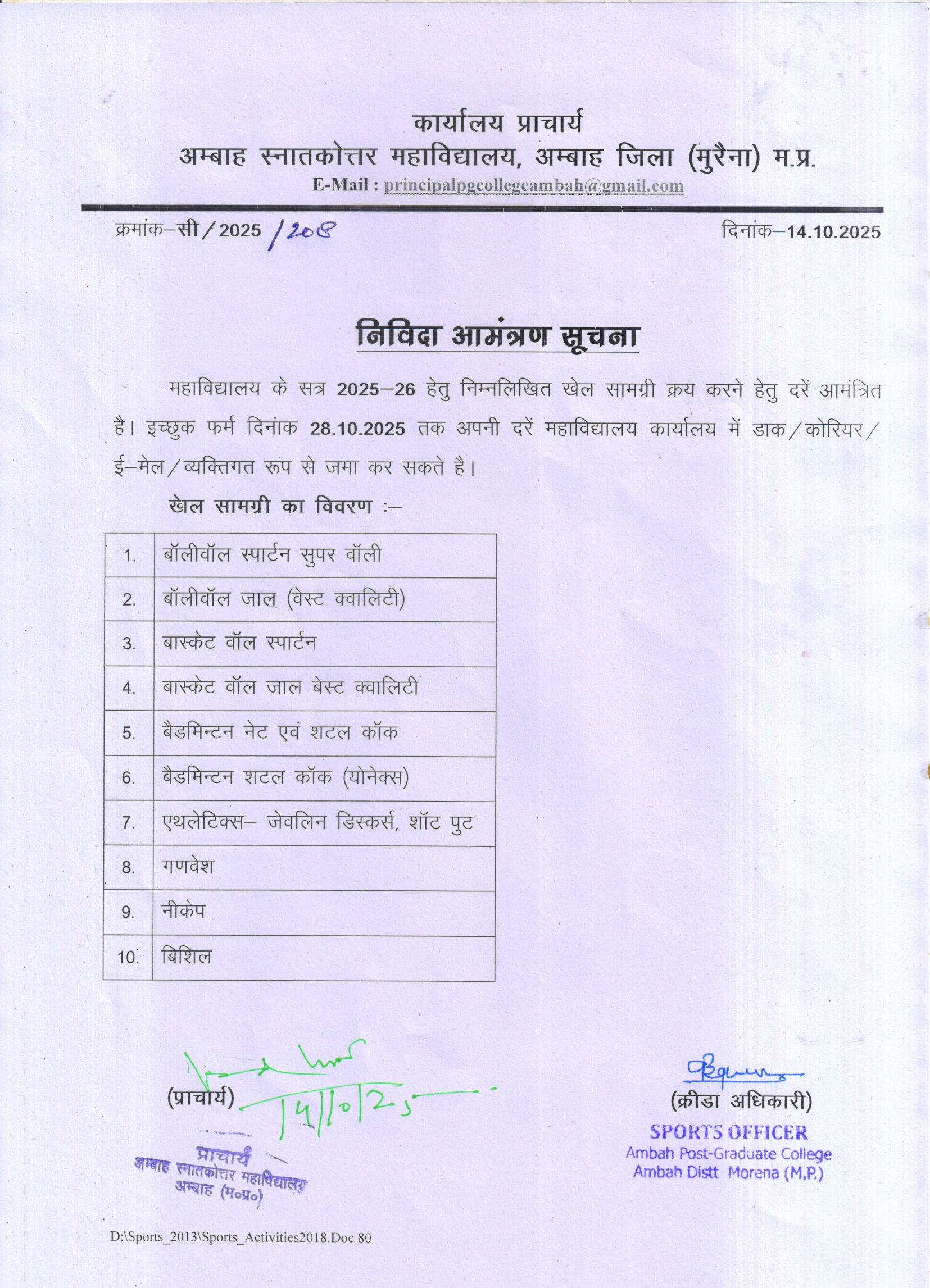 > स्पोर्ट कुटेशन अंतिम तिथि वृधि